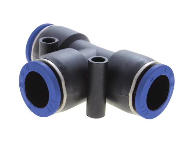 NPEG pneumatic tube fitting is a tee with different diameters to connect tubes of different sizes for efficient pneumatic system operation.
